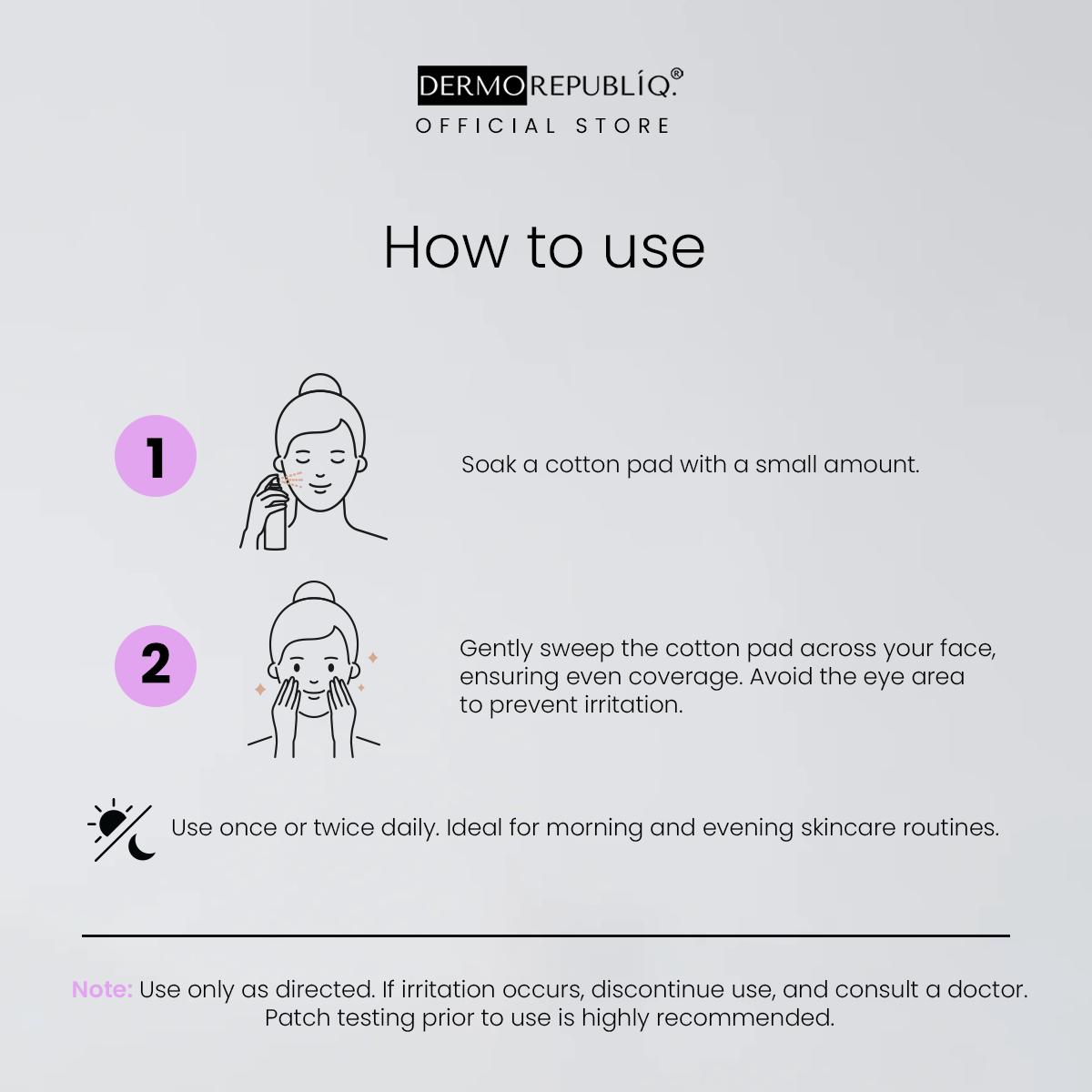 Apply to clean, dry skin using and gently sweep across the face and neck, avoiding the eye area. Do not rinse. Use only as directed. If irritation occurs, discontinue use and consult a doctor. Patch testing before use is advised.
